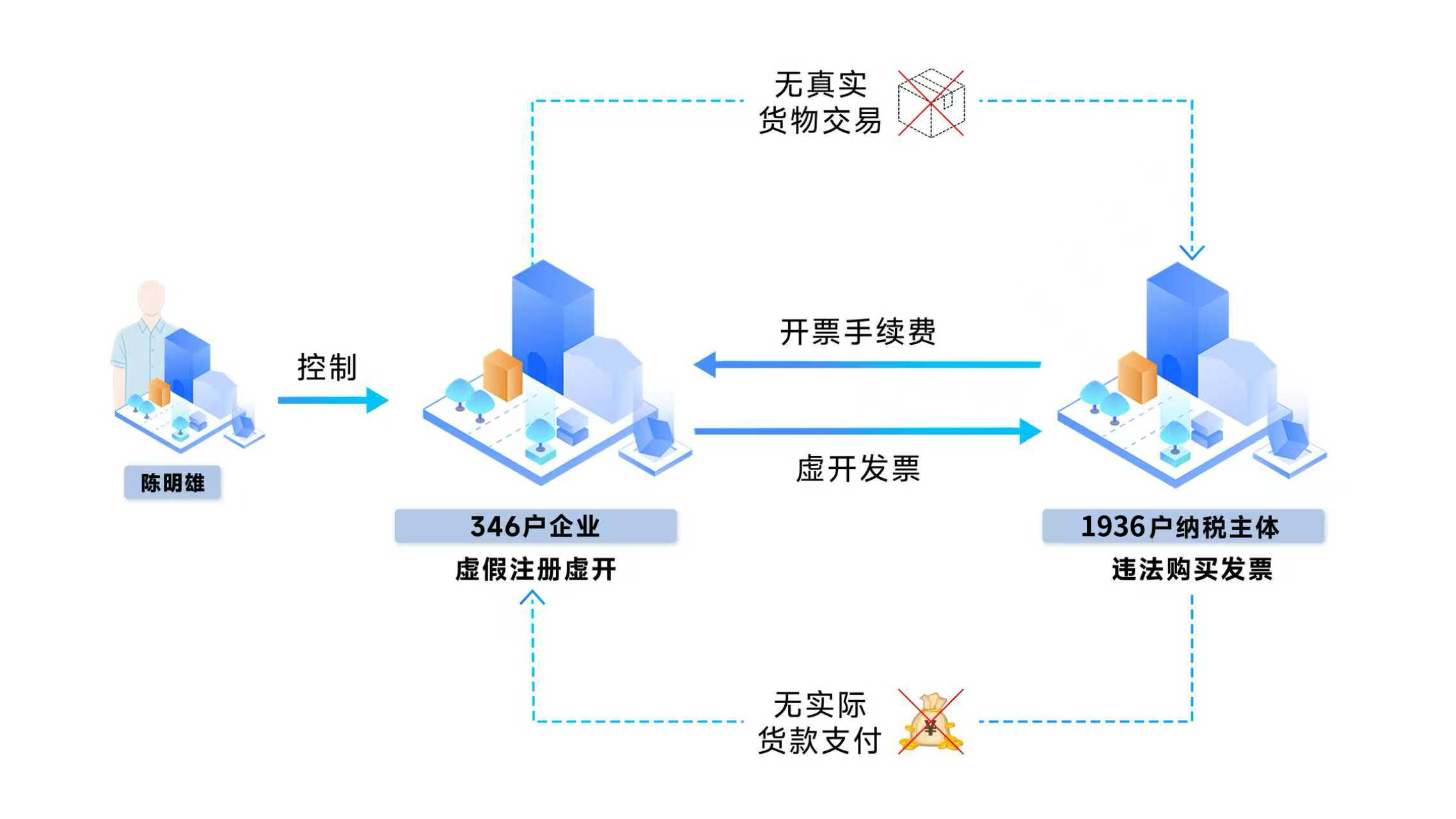 团伙企业实际控制人陈明雄等人供述了“冒用信息虚开发票”过程:该团伙通过非法渠道购买公民信息,注册成立346户“空壳”公司,根据下游企业“购票需求”,对外虚开增值税普通发票,并按一定比例收取开票费用。经查,团伙企业累计对外虚开增值税普通发票7846份,涉及下游受票企业1936户,涉案发票金额高达12亿元。