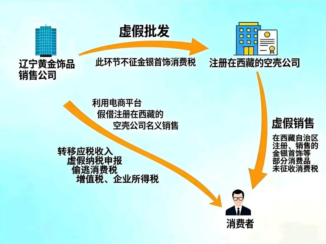 根据相关政策要求,西藏自治区对在本地注册、销售的金银首饰等消费品,暂未征收消费税。结合这个情况,税务人员初步判断潮尊公司“沈阳批发、西藏零售”的模式,存在转移应税收入、偷逃消费税的嫌疑。